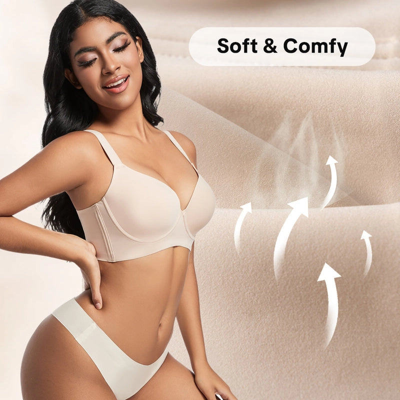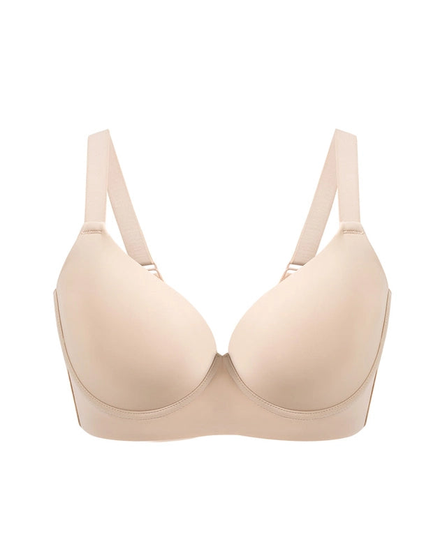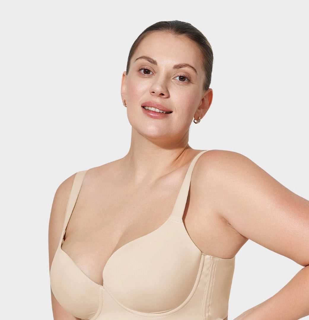 5D-skåldesign kombinert med brede sidevinger, polstrede stropper og en U-formet rygg gir maksimal støtte mot heng. Den glatter ut bulker på ryggen og korrigerer fett ved armhulene for en flatterende silhuett.